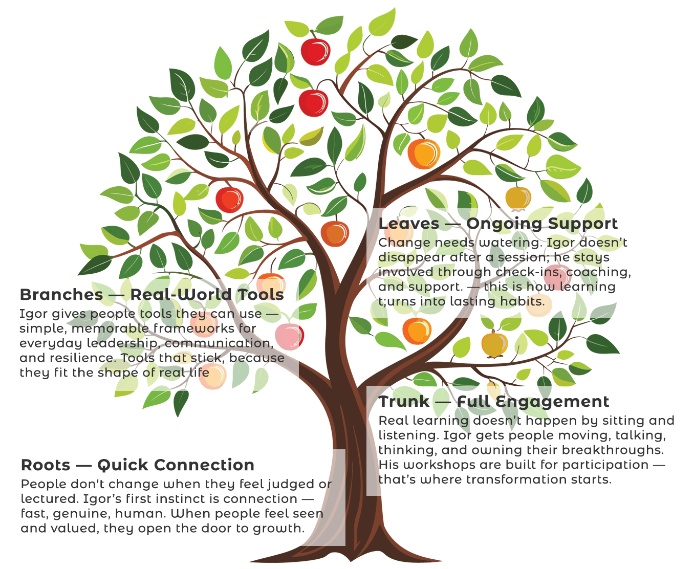 That real-world mix makes him uniquely effective at working with people from every walk of life — from boardrooms to orchards. Igor is known for building quick trust, offering simple tools that stick, and helping teams move forward with real confidence.